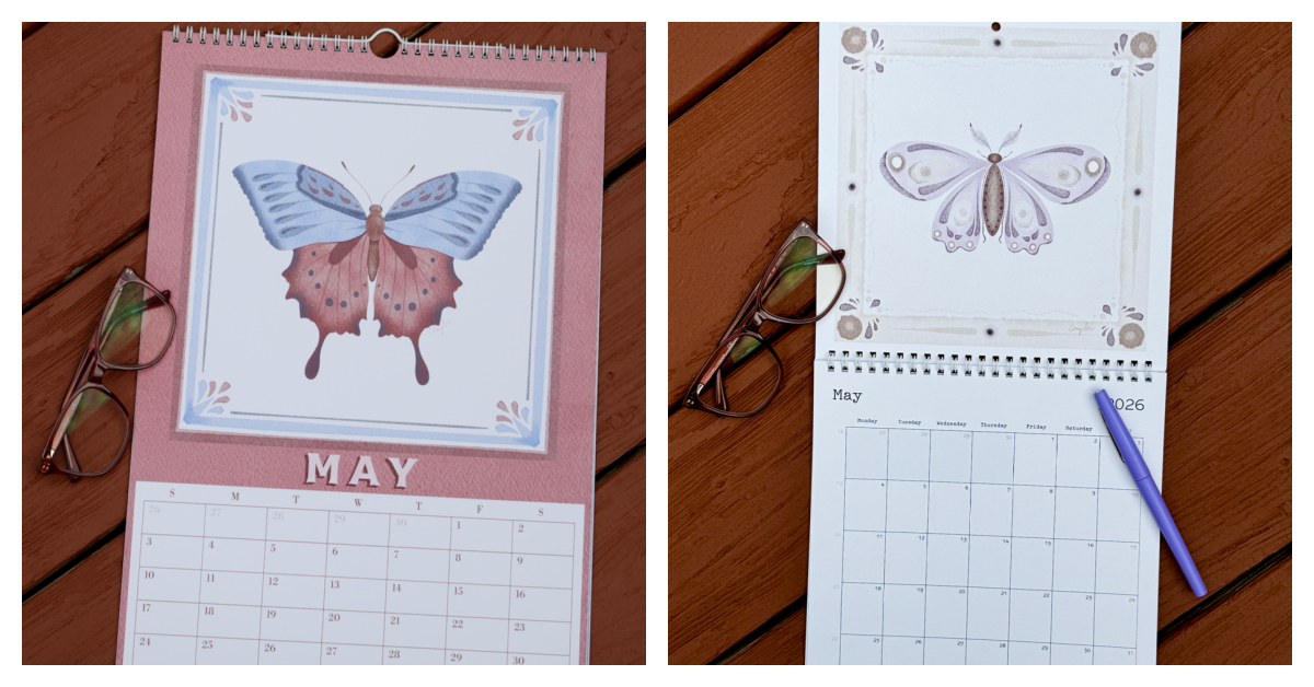 For 2026, I created not two watercolor-style butterfly calendars. Each page features a butterfly with wings and shapes that are true to nature, while the wing designs are straight from my imagination. The borders give a touch of cottagecore charm — floral, delicate, and a little bit whimsical.