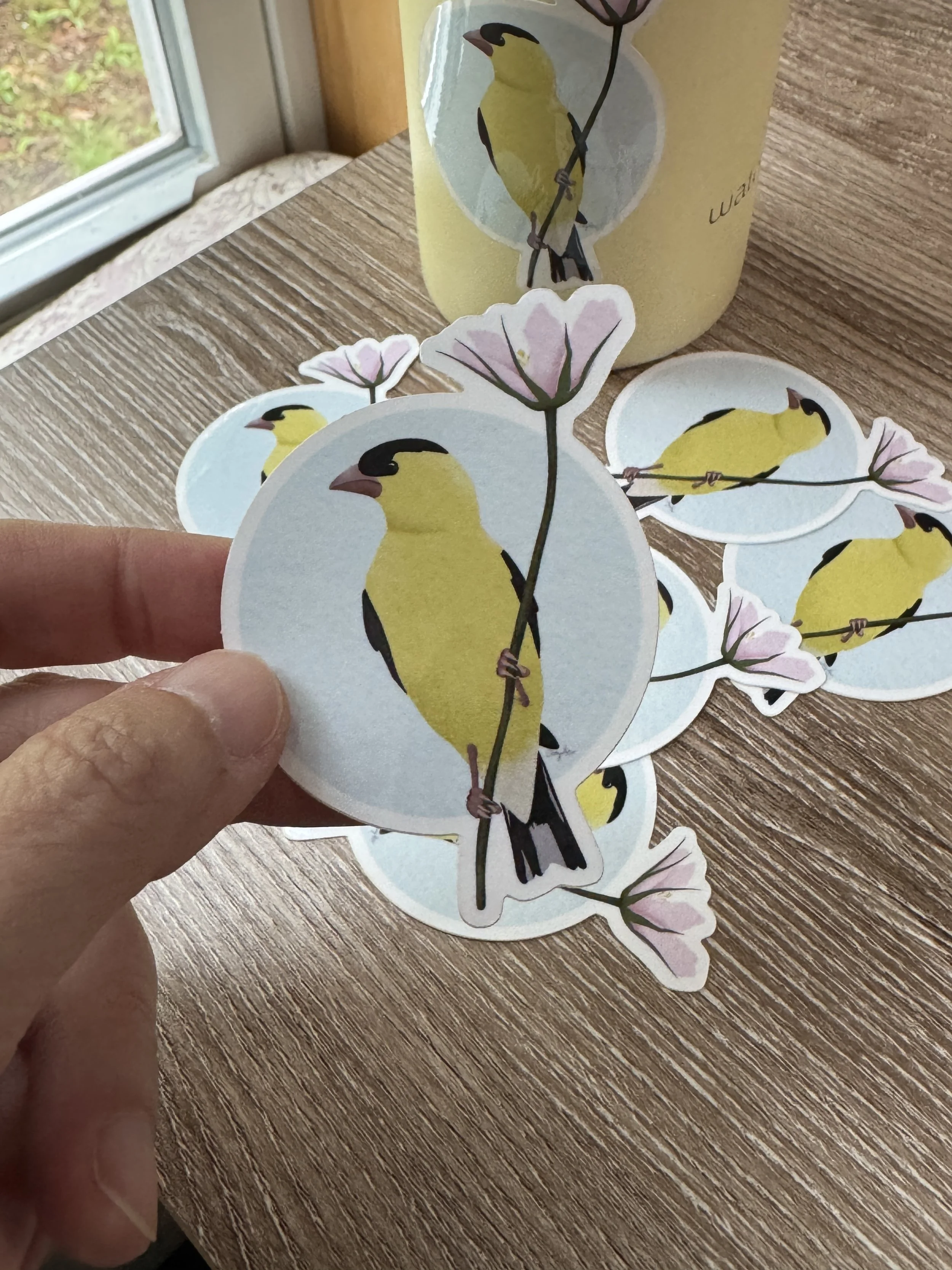 I also created a standalone design featuring a goldfinch holding a pink flower stem, which was fun turning that into actual physical stickers.